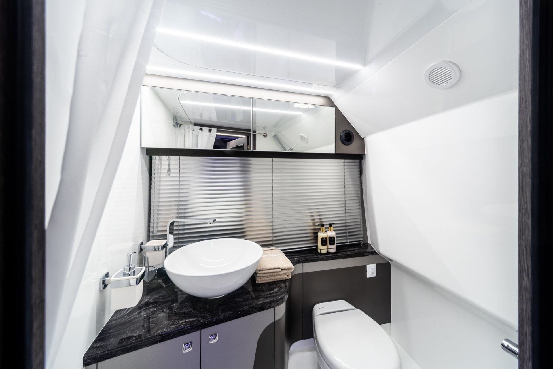 The cabin consists of comfortable and elegant sofas with pull-out table, a luxurious sleeping space, and a fully equipped bathroom with shower and electric toilet. As an option, air conditioning and heating can be ordered.