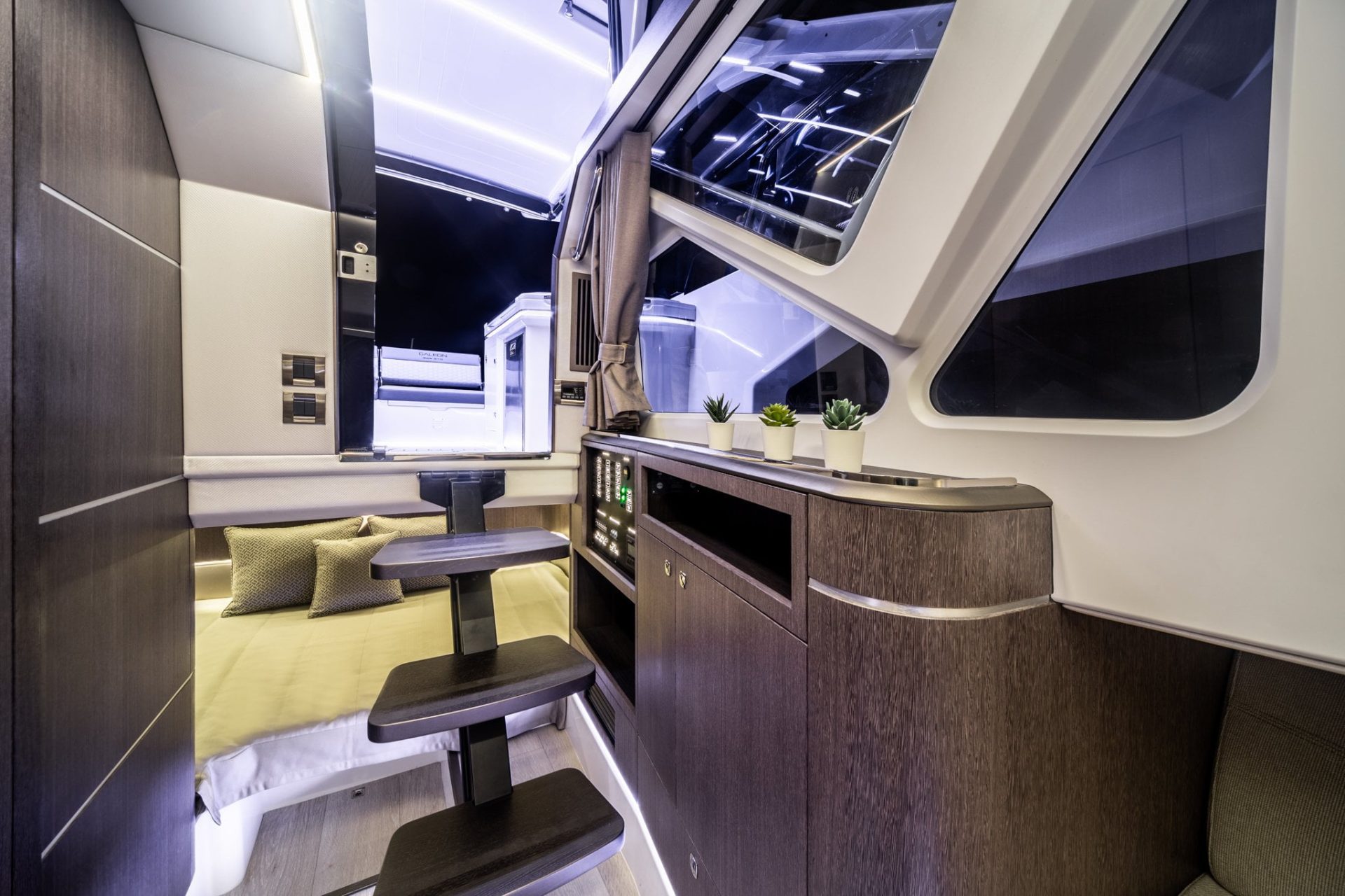 Stand out on the Galeon 325 GTO is the completely new “bowrider” style at the Galeon Yachts shipyard. The upholstery designed with different details and comforts like armrests, cup holders add elegance and bring comfort to the users. Access to the bow from the aft cockpit is on the port side, through a glass corridor where a sliding roof opens.